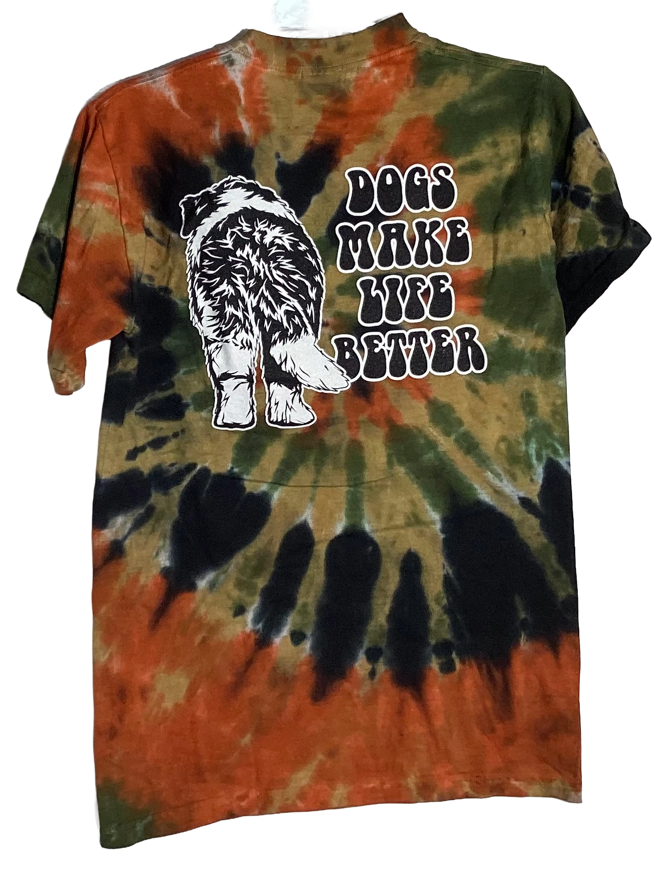 Gibson's Funk Wear t-shirts are gluten-free, 100% cotton and custom tie-dyed using environmentally safe procion dyes. 2 color front and back prints. All back prints are the "Dogs Make Life Better" print unless noted. No two shirts will be exactly the same.