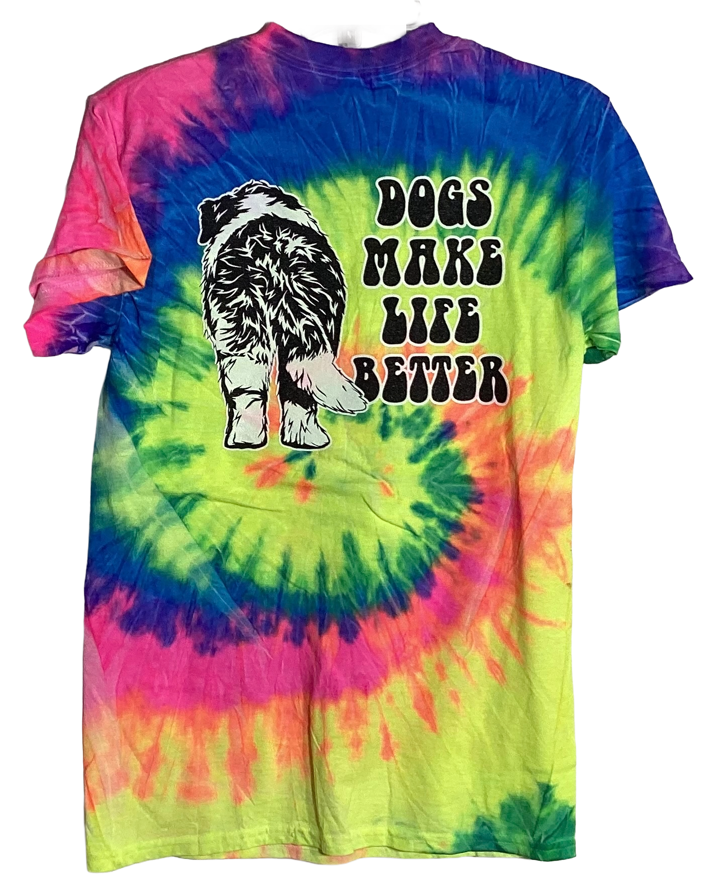Gibson's Funk Wear t-shirts are gluten-free, 100% cotton and custom tie-dyed using environmentally safe procion dyes. 2 color front and back prints. All back prints are the "Dogs Make Life Better" print unless noted. No two shirts will be exactly the same.
