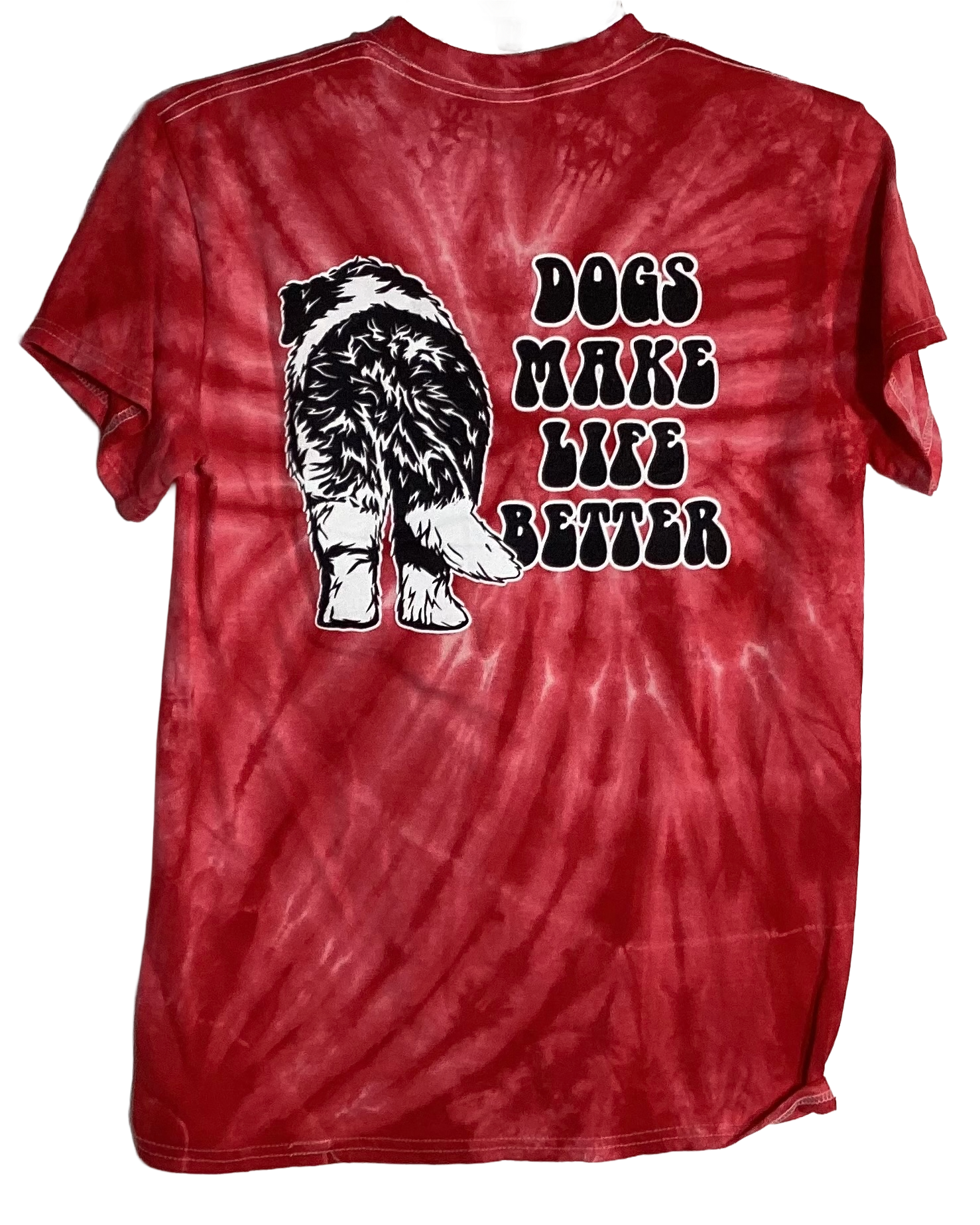 Gibson's Funk Wear t-shirts are gluten-free, 100% cotton and custom tie-dyed using environmentally safe procion dyes. 2 color front and back prints. All back prints are the "Dogs Make Life Better" print unless noted. No two shirts will be exactly the same.